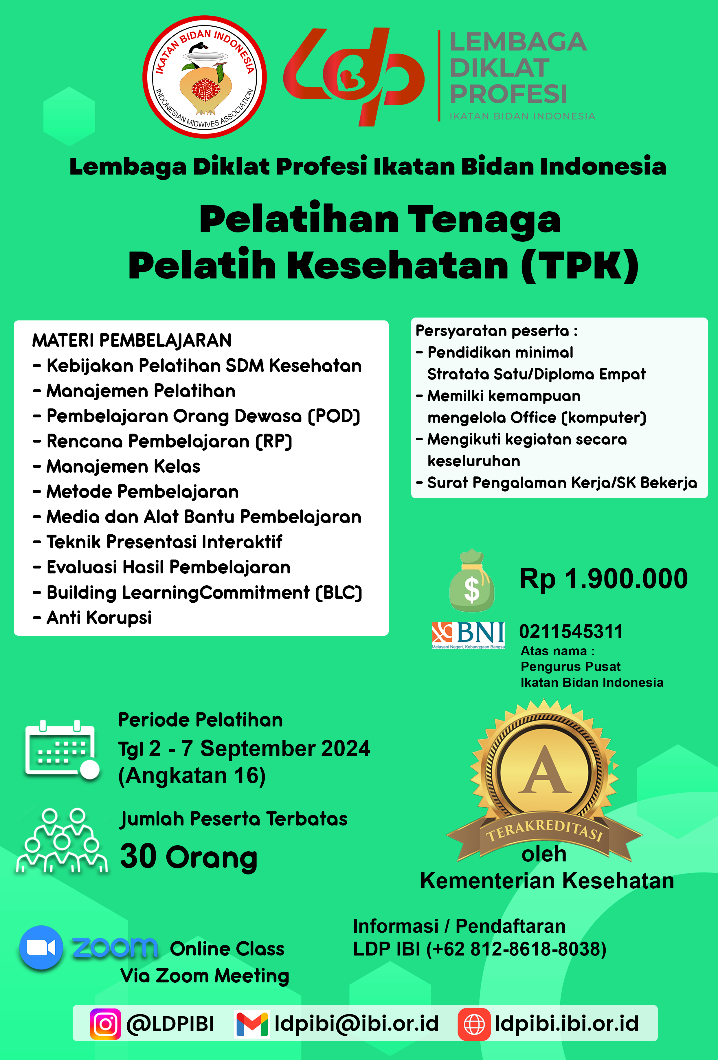 Lembaga Diklat Profesi Ikatan Bidan Indonesia menyelenggarakan Pelatihan Tenaga Pelatih Kesehatan (TPK) Angkatan 16 yang dilaksanakan pada tanggal 2 – 7 September 2024. Pelatihan ini telah terakreditasi oleh Kementerian Kesehatan dan dilakukan secara online via Zoom Meeting.